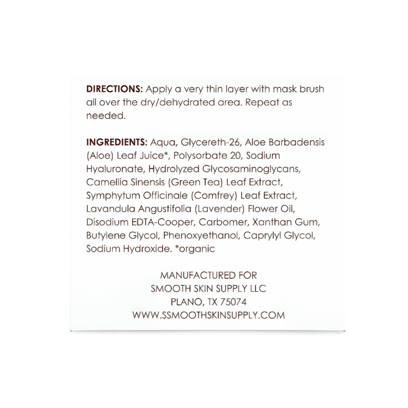 Ingredients: Aqua, Glycereth-26, Aloe Barbadensis (Aloe) Leaf Juice*, Polysorbate 20, Sodium Hyaluronate, Hydrolyzed Glycosaminoglycans, Camellia Sinensis (Green Tea) Leaf Extract, Symphytum Officinale (Comfrey) Leaf Extract, Lavandula Angustifolia (Lavender) Flower Oil, Disodium EDTA-Cooper, Carbomer, Xantham Gum, Butylene Glycol, Phenoxyethanol, Caprylyl Glycol, Sodium Hydroxide. *Organic